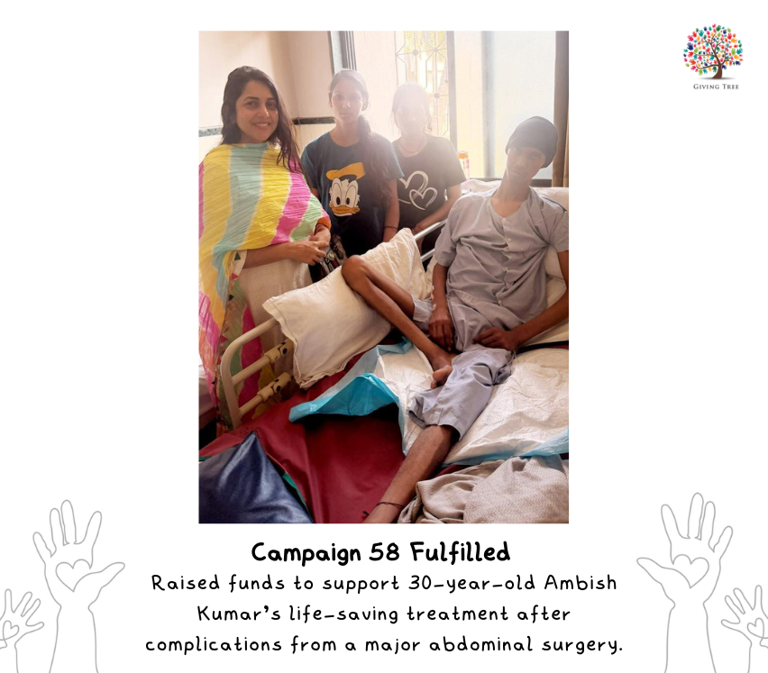 We are grateful to share that Giving Tree NGO has successfully donated Rs 1,80,974 to support Mr. Ambish Kumar’s life-saving medical treatment.