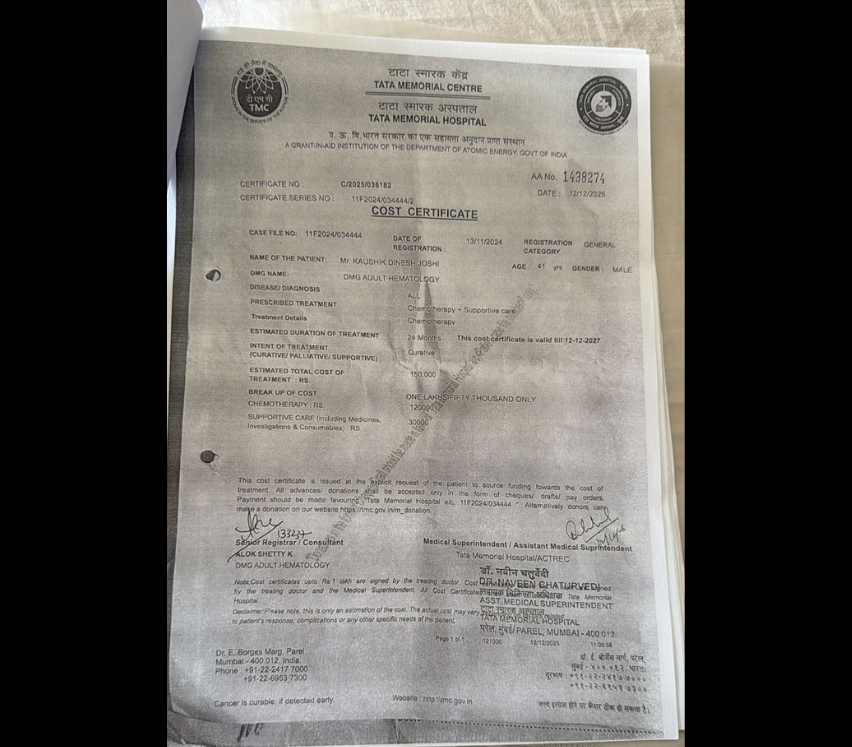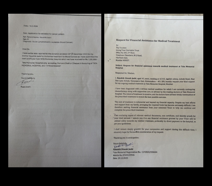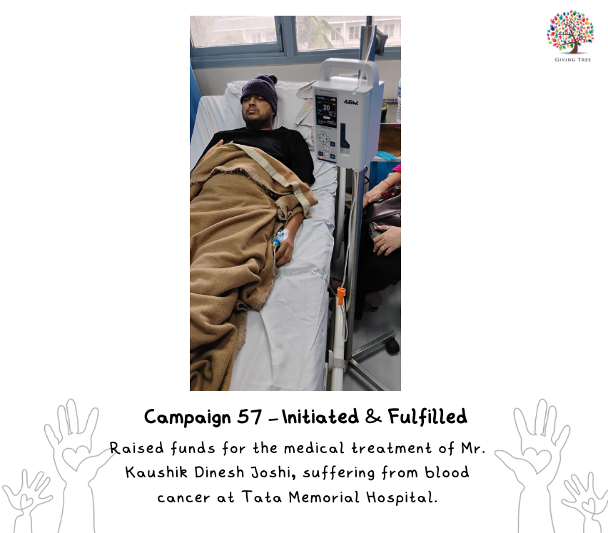 In the month of February, Giving Tree, in association with Alliance Insurance Brokers Pvt. Ltd., came together to support Mr. Kaushik Dinesh Joshi (41) from Nalasopara, who is currently battling blood cancer and undergoing chemotherapy along with supportive treatment at Tata Memorial Hospital, Mumbai.