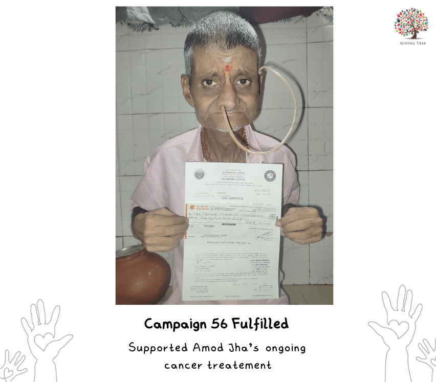 For the fifth time, The Giving Tree community came together to support Mr. Amod Jha in his ongoing battle against cancer. Mr. Jha continues to undergo treatment at Tata Memorial Hospital, and as part of our February campaign, we aimed to raise ₹20,000 to assist with his chemotherapy and medical expenses.