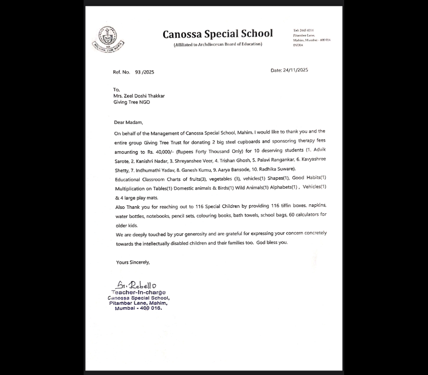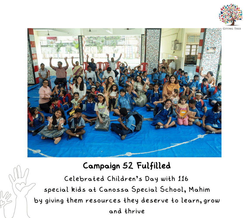 The Giving Tree proudly concludes one of our most meaningful initiatives - celebrating Children’s Day with the incredible students of Canossa Special School, Mahim, a school dedicated to 116 specially-abled children including many who are on the autism spectrum. With no special grants supporting them, their needs are simple yet essential for growth, learning & therapy.