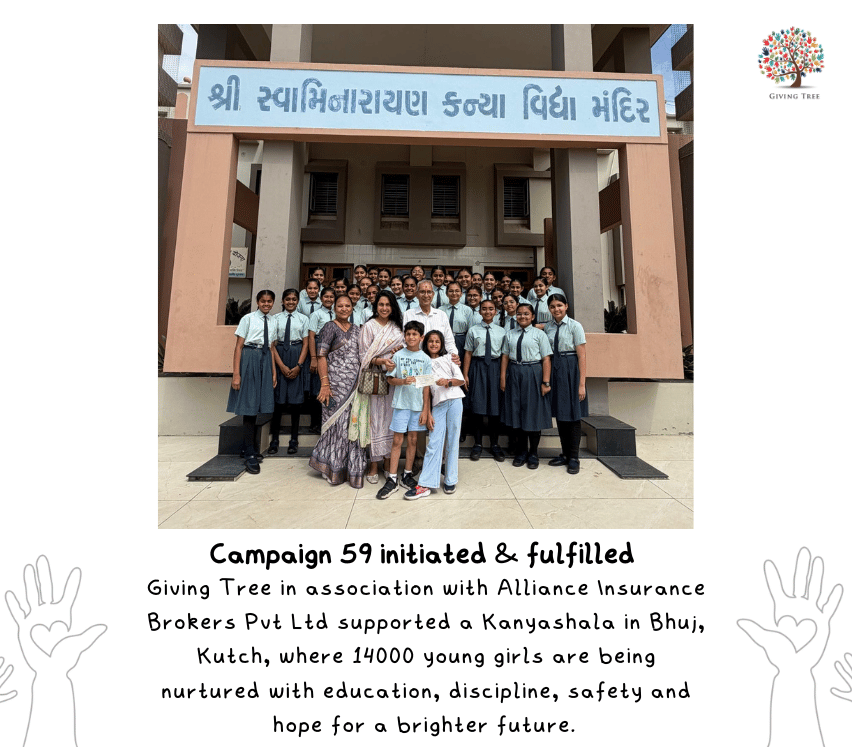 Giving Tree, in association with Alliance Insurance Brokers Pvt. Ltd., had the privilege of donating 15 lakh Rs to Swaminarayan Kanyashala in Bhuj, Kutch, where thousands of young girls are being nurtured with education, discipline, safety, and hope. 📚🌸
